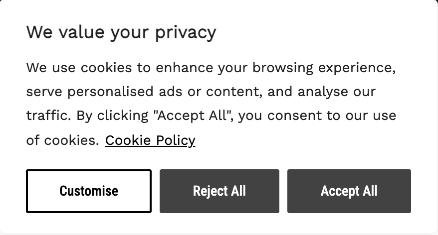 - Customisable, brand-friendly banners: Build a cookie bar that matches your website design, with clear Accept/Reject options and granular choices.