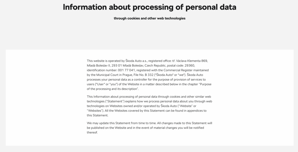 Skoda, a prominent car manufacturer in the Czech Republic, complies with the requirement by providing a detailed cookie notice.