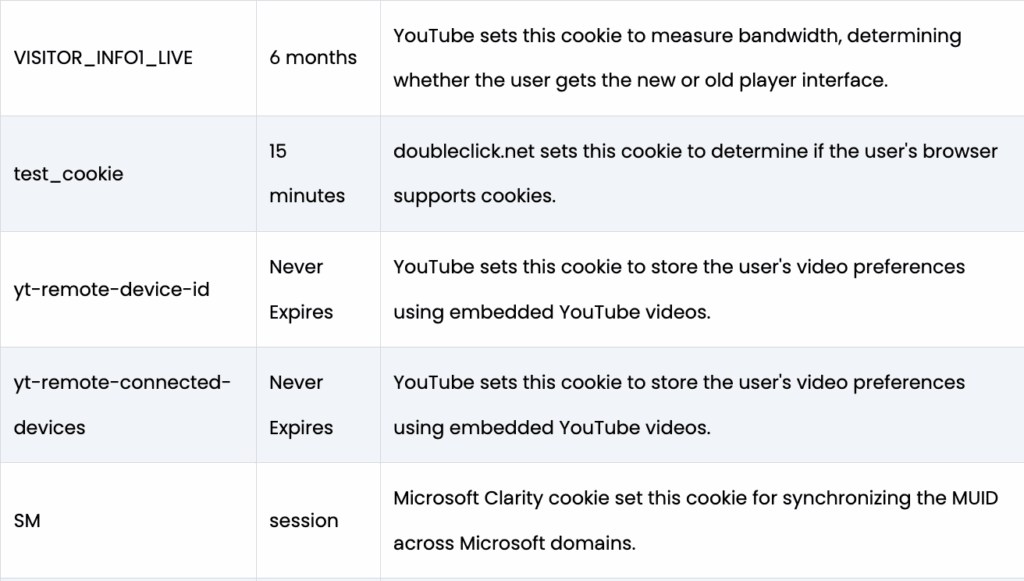 - Purpose and duration of each cookies