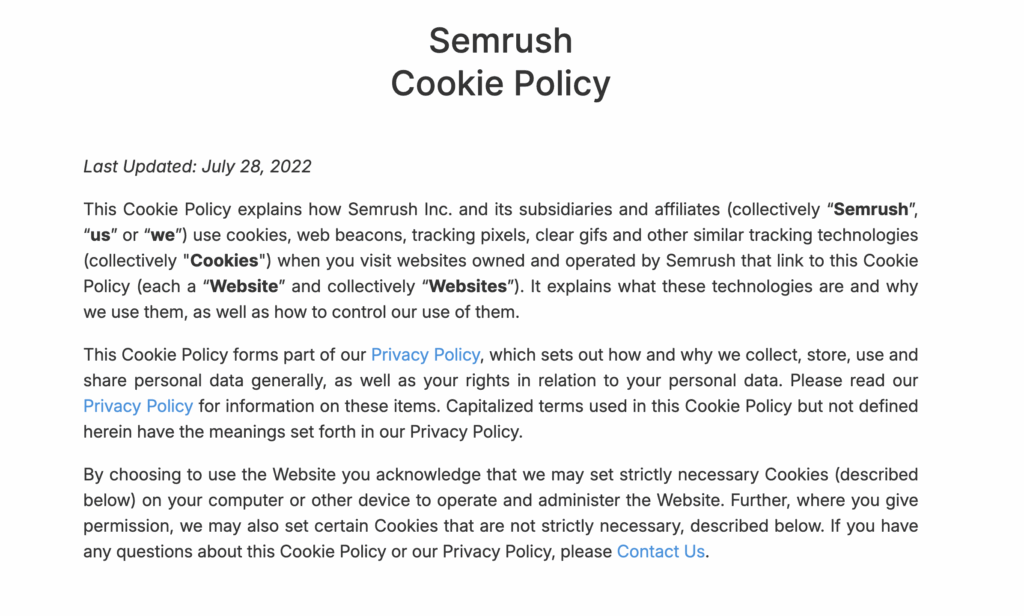 Here is an example of a cookie policy introduction from Semrush.