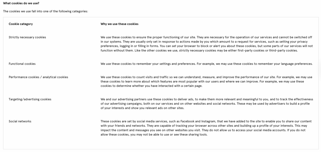 A cookie policy is a document that lists all cookies used on your site and explains each one’s purpose, lifespan and the data it collects.