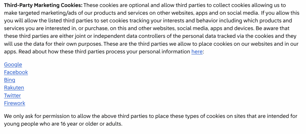 Identify any external services that set cookies (like Google Analytics, Facebook, advertising networks or payment providers) and link to their policies.