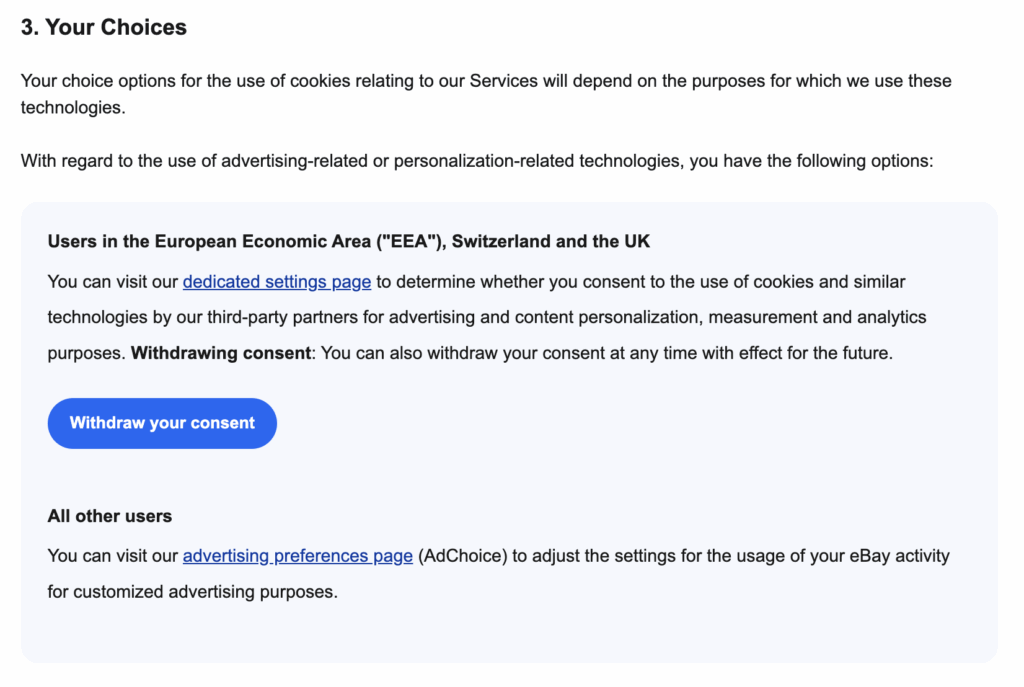 Provide instructions for opting out or changing preferences via your banner, browser settings or industry tools, and tell users how to contact you with questions. Make clear that consent can be withdrawn at any time.