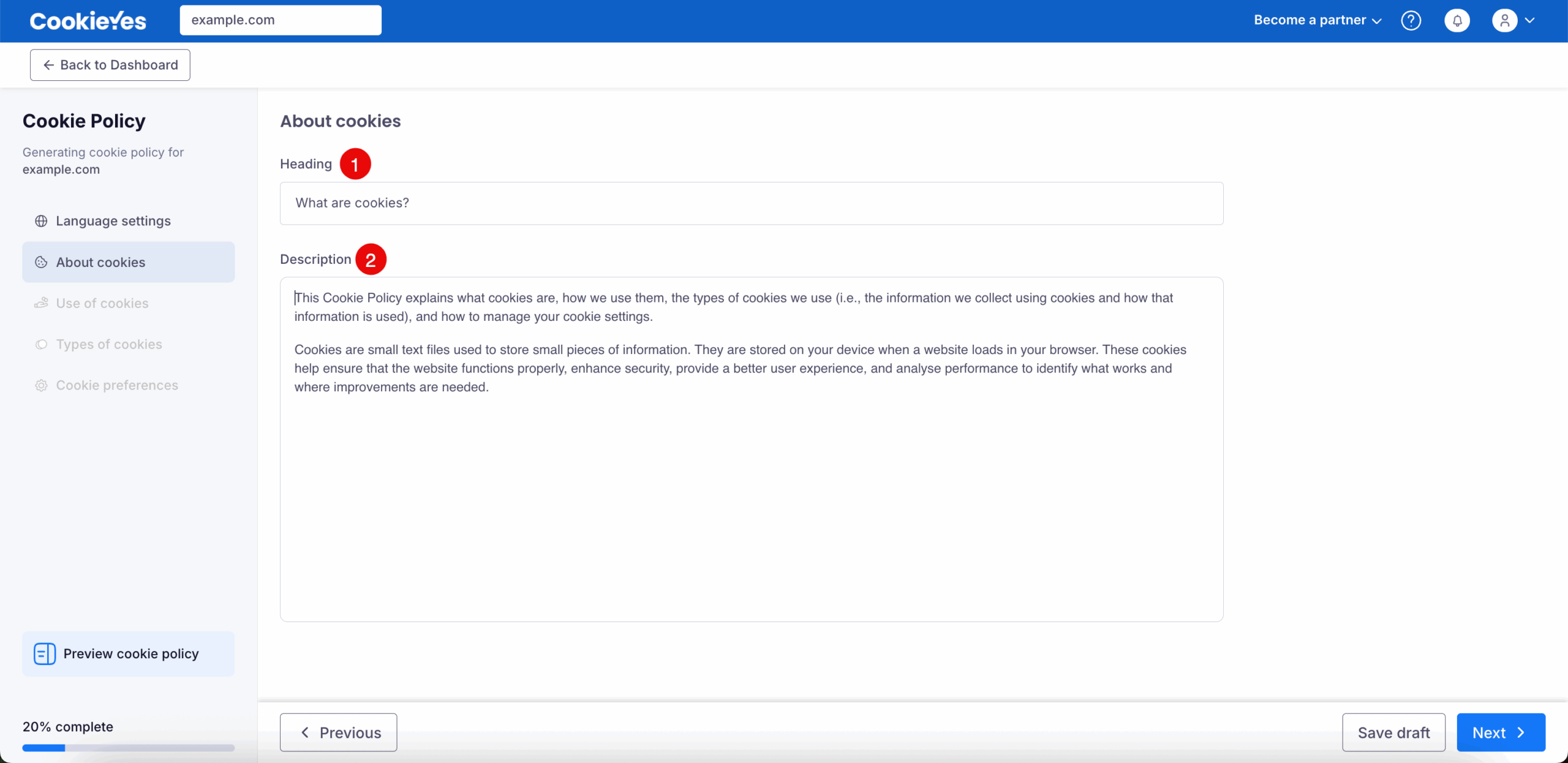 In this step, you can define the introductory section of your Cookie Policy by explaining what cookies are and why your website uses them.